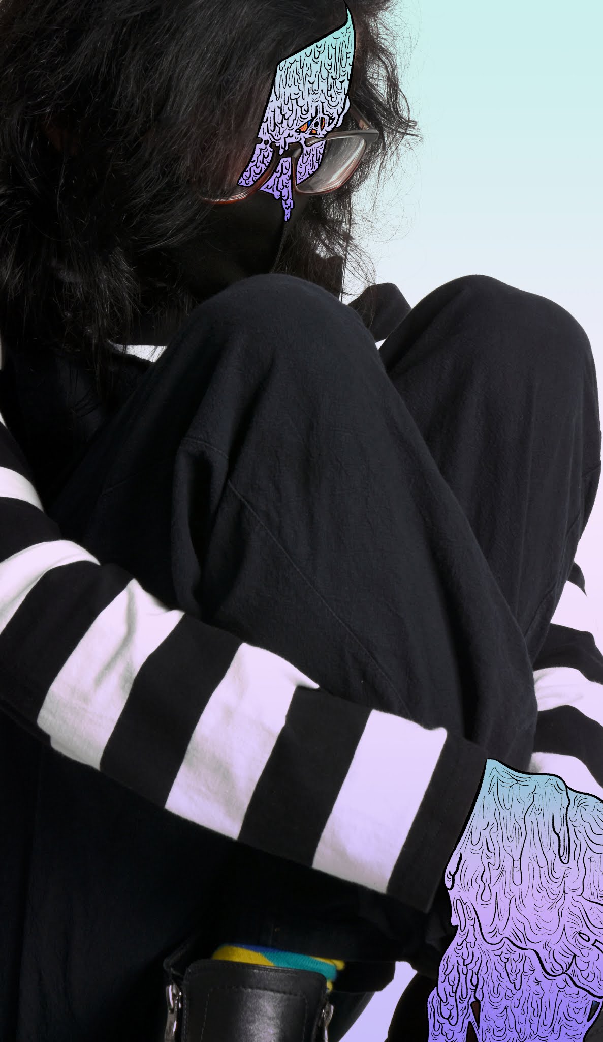 I finished off the standard flat purple colour with a soft gradient to add a slight shadow to it due to it being a part of my art style. I also added custom chromatic aberration behind a rough cutout of myself as I saw that being a theme in Spangler's work, although may not have had enough time in this session to fully explore the idea and execute it properly, although it is only a minor detail here and thankfully does not distract from the main illustrative element.